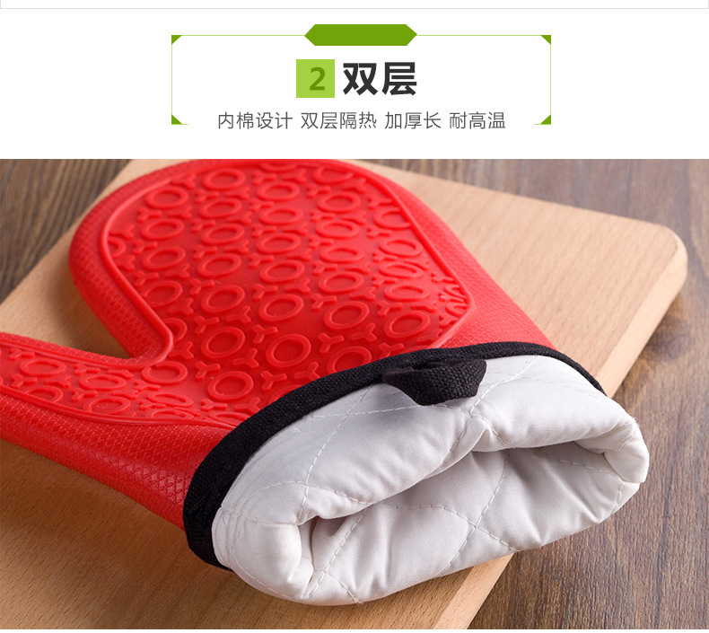 包裝:單只裝開口PP袋新款加長加厚雙層防燙硅膠手套,采用棉布加硅膠雙層防燙設(shè)計(jì),棉布部分可以加印logo,雙層設(shè)計(jì)更加耐熱,該手套具有清洗方便、多重防滑、雙層耐熱、防水耐用等優(yōu)勢。