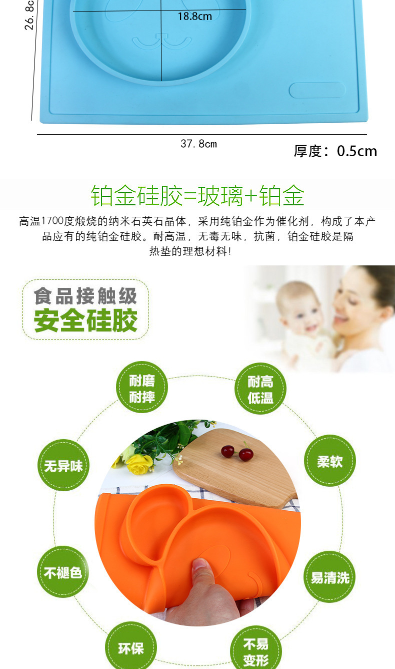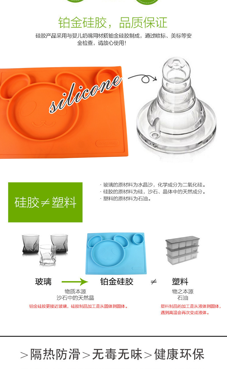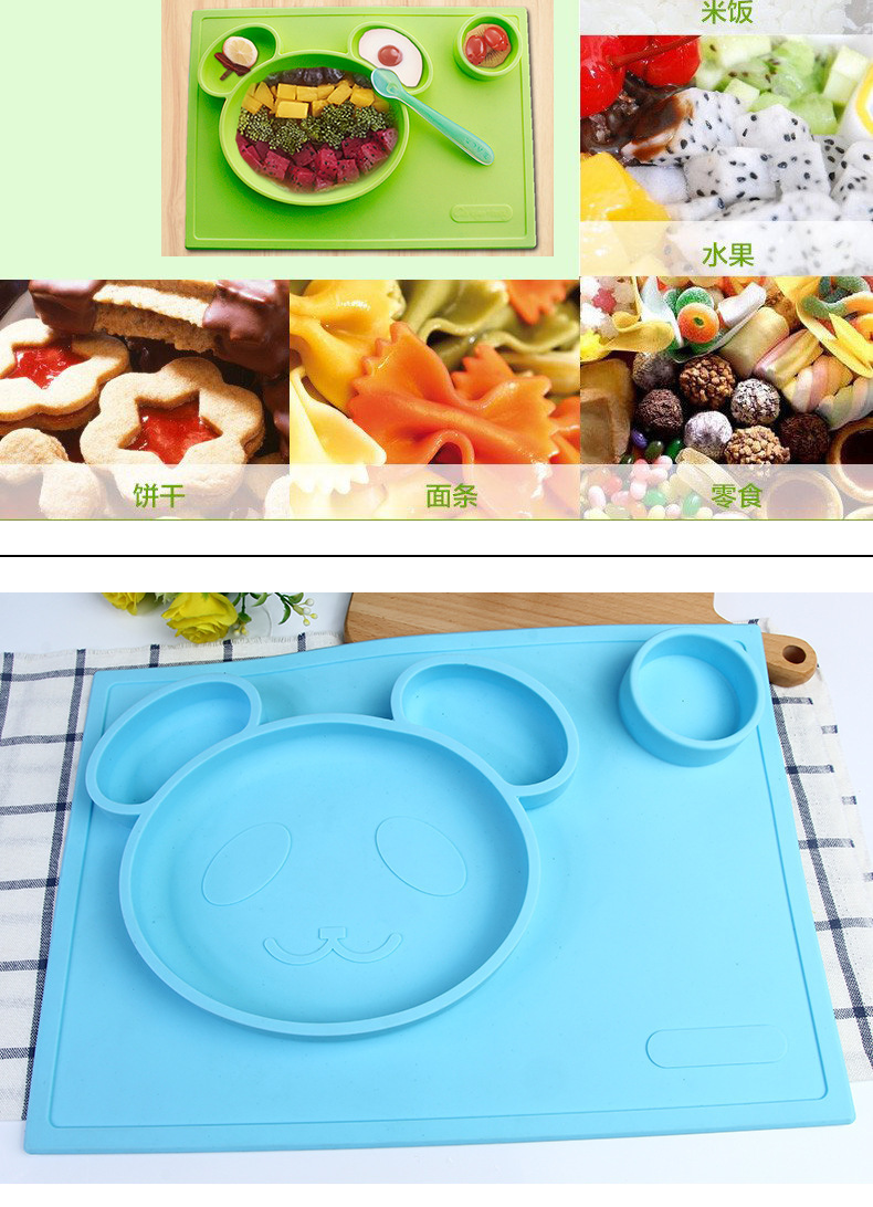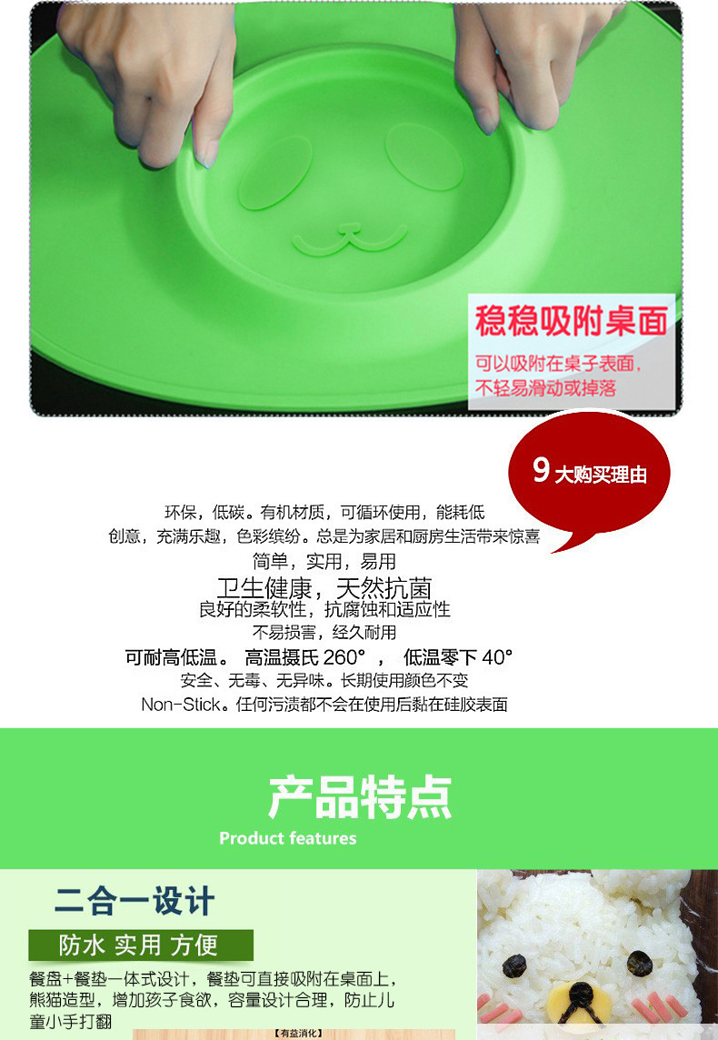 特點(diǎn):二合一設(shè)計(jì),防水、實(shí)用、方便,餐盤+餐墊一體式設(shè)計(jì),餐墊可直接吸附在桌面上,熊貓?jiān)煨?,增加孩子的食欲,容量設(shè)計(jì)合理,防止兒童小手打翻。